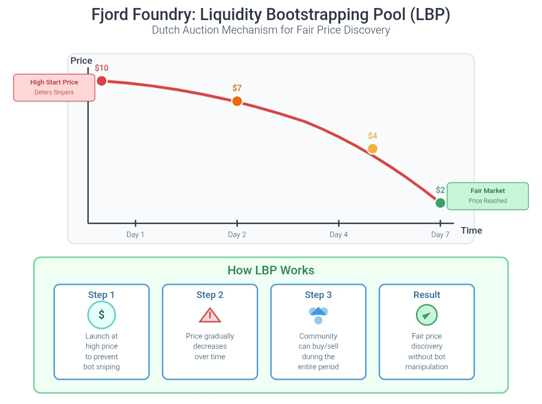 Fjord Foundry is well known for its Dutch auction style of launchpads called Liquidity Bootstrapping Pools (LBPs), which involves the platform listing IDO prices at very high levels to prevent snipers from claiming all spots and whales from manipulating prices during sales.