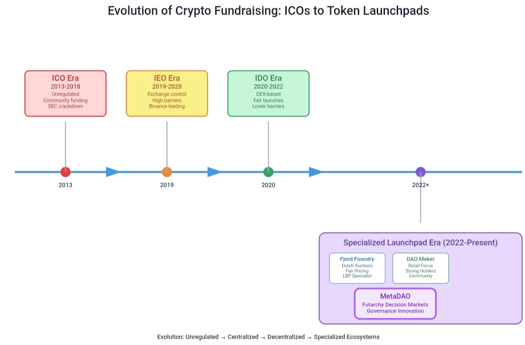 Initial DEX Offerings (IDOs) emerged as an alternative, allowing founders to raise funds through DEX launchpads via fair launches or structured presales based on investor capabilities. As most DEXs couldn't support these systems, specialized platforms like Believe App for social token funding, Fjord Foundry for permissionless fundraising, and MetaDAO for community-aligned projects evolved into today's token launchpads. This swift evolution from ICOs to decentralized launchpads highlights blockchain's rapid technological and economic advancement.