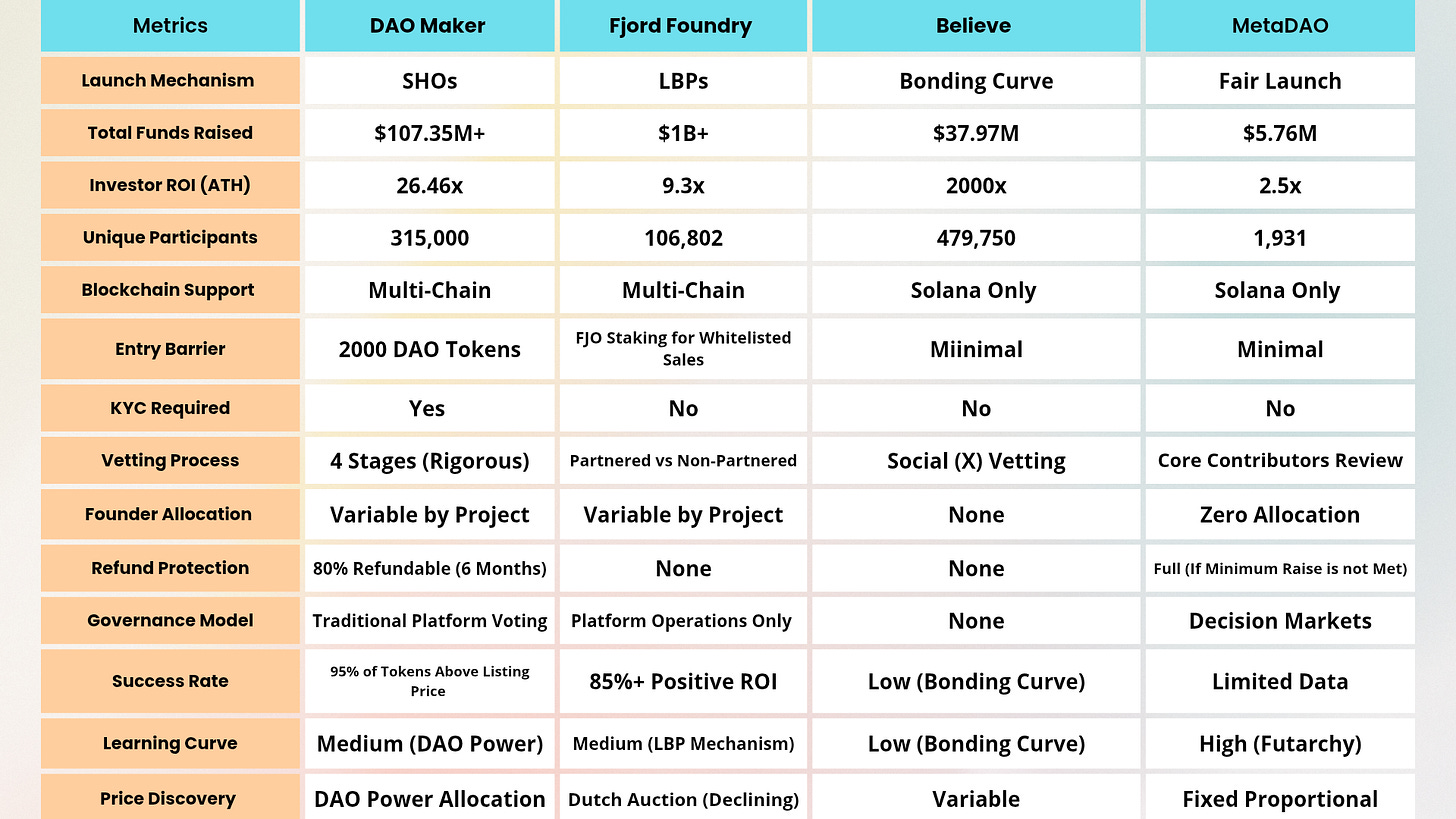 We are comparing Fjord Foundry, DAO Maker, Believe App, and MetaDAO to help founders and teams understand which launchpad suits their token launch or fundraise in the long term in terms of holder behavior, verification and regulatory processes, and overall operations.